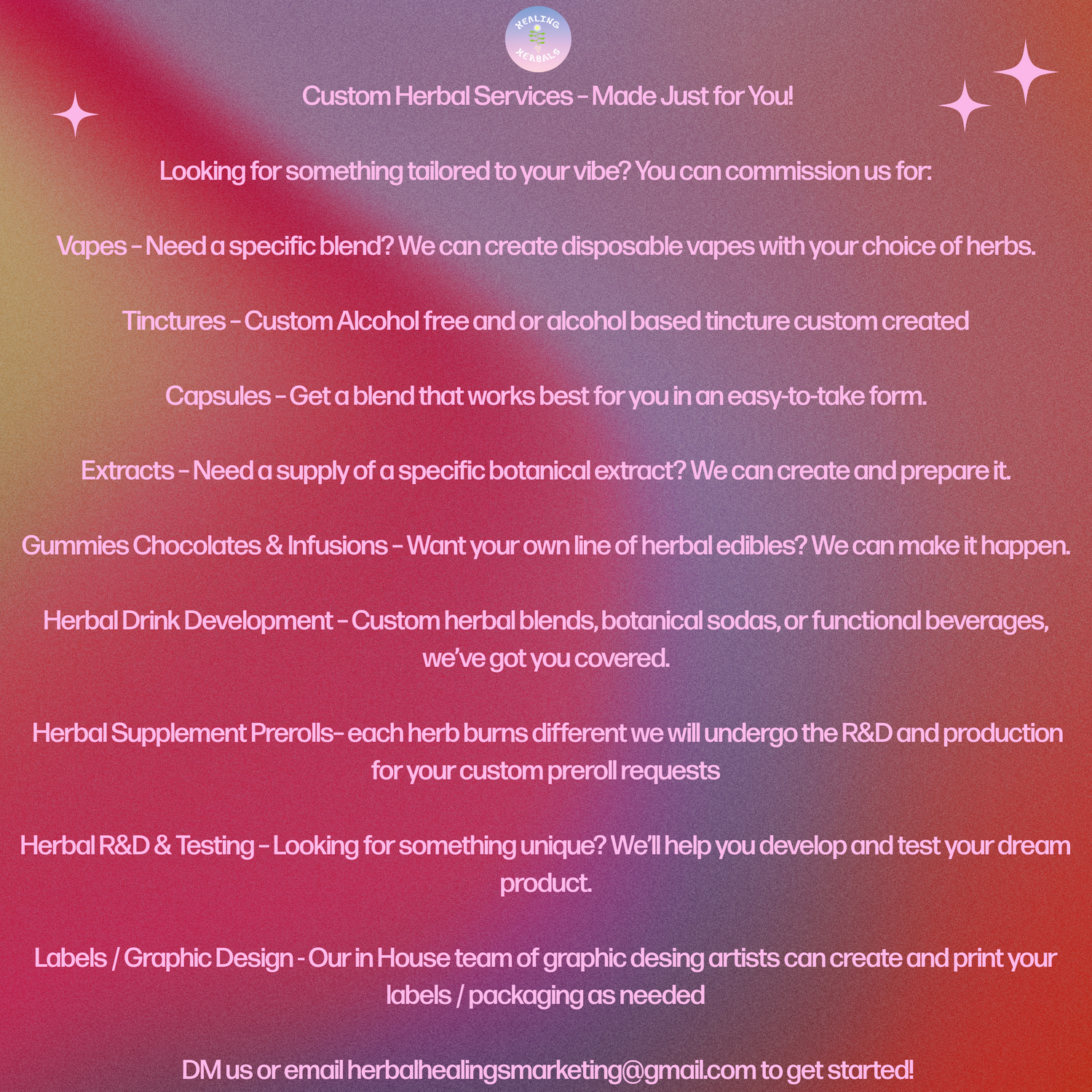 We offer white labeling as well we have helped brands make extractions, herbal infusions, capsules, vapes, prerolls, topicals, gummies, candies and or any other project